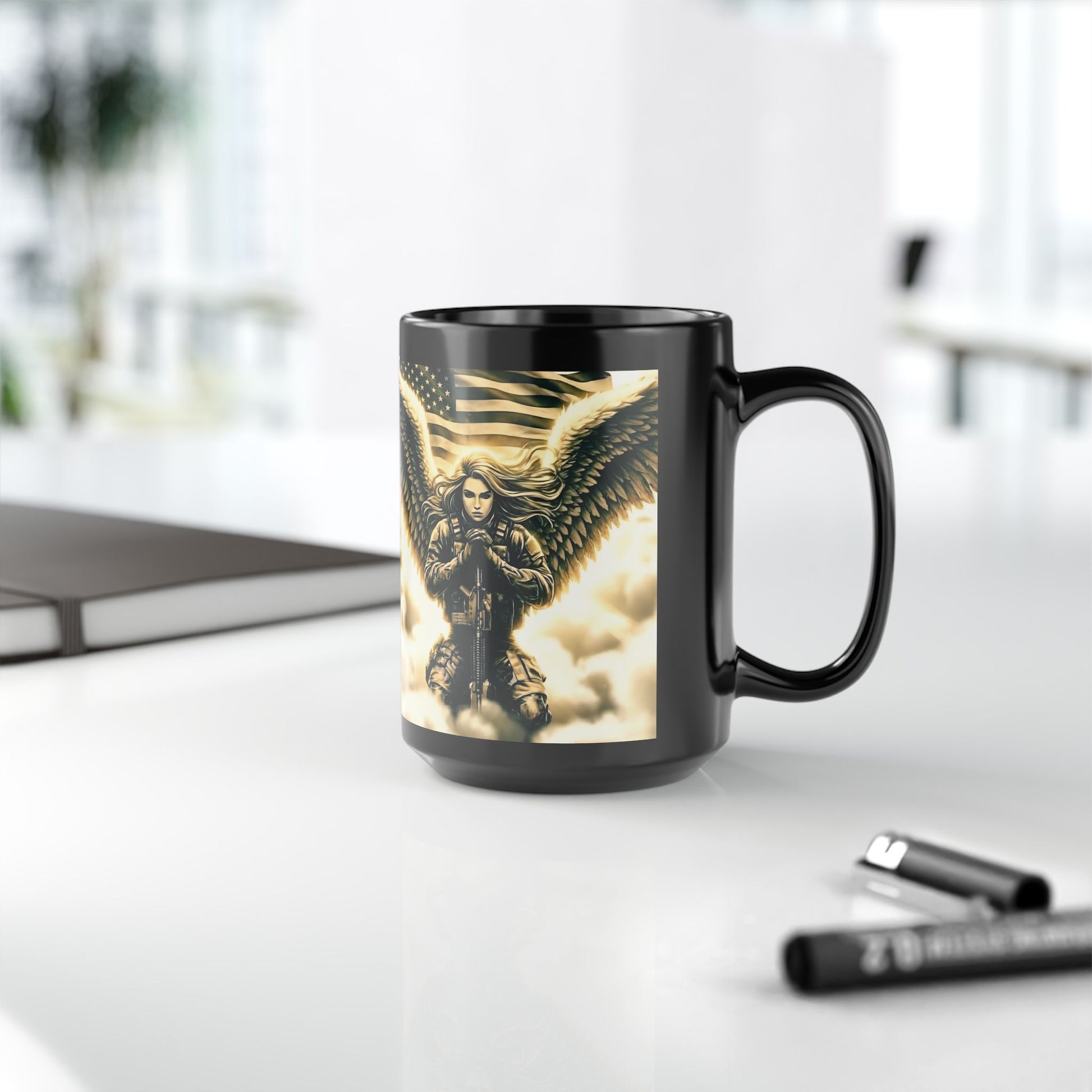 Angel of Valor Black Mug — Patriotic Guardian Wings Coffee Cup (11oz/15oz)