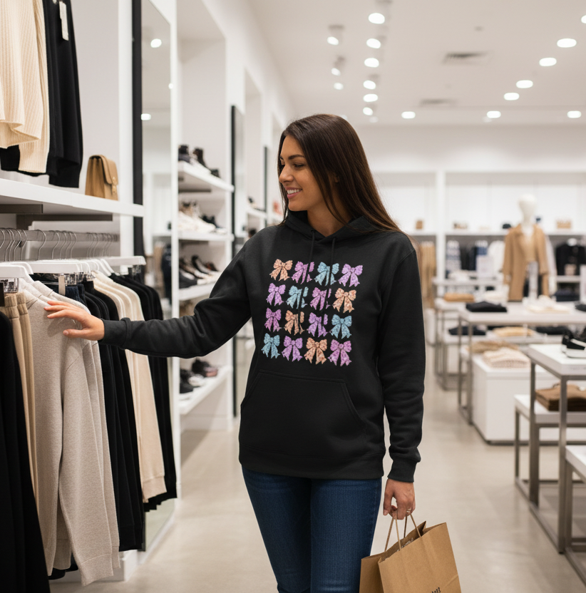This hoodie makes an excellent choice for anyone looking to brighten up their day with its captivating bow design. Get yours now to add a flair of uniqueness to your collection!