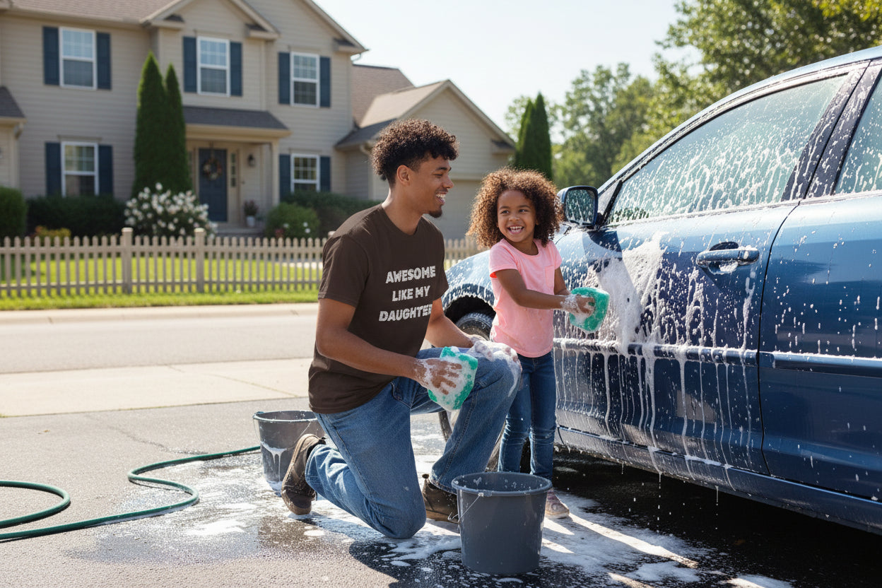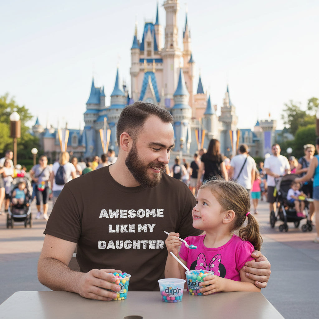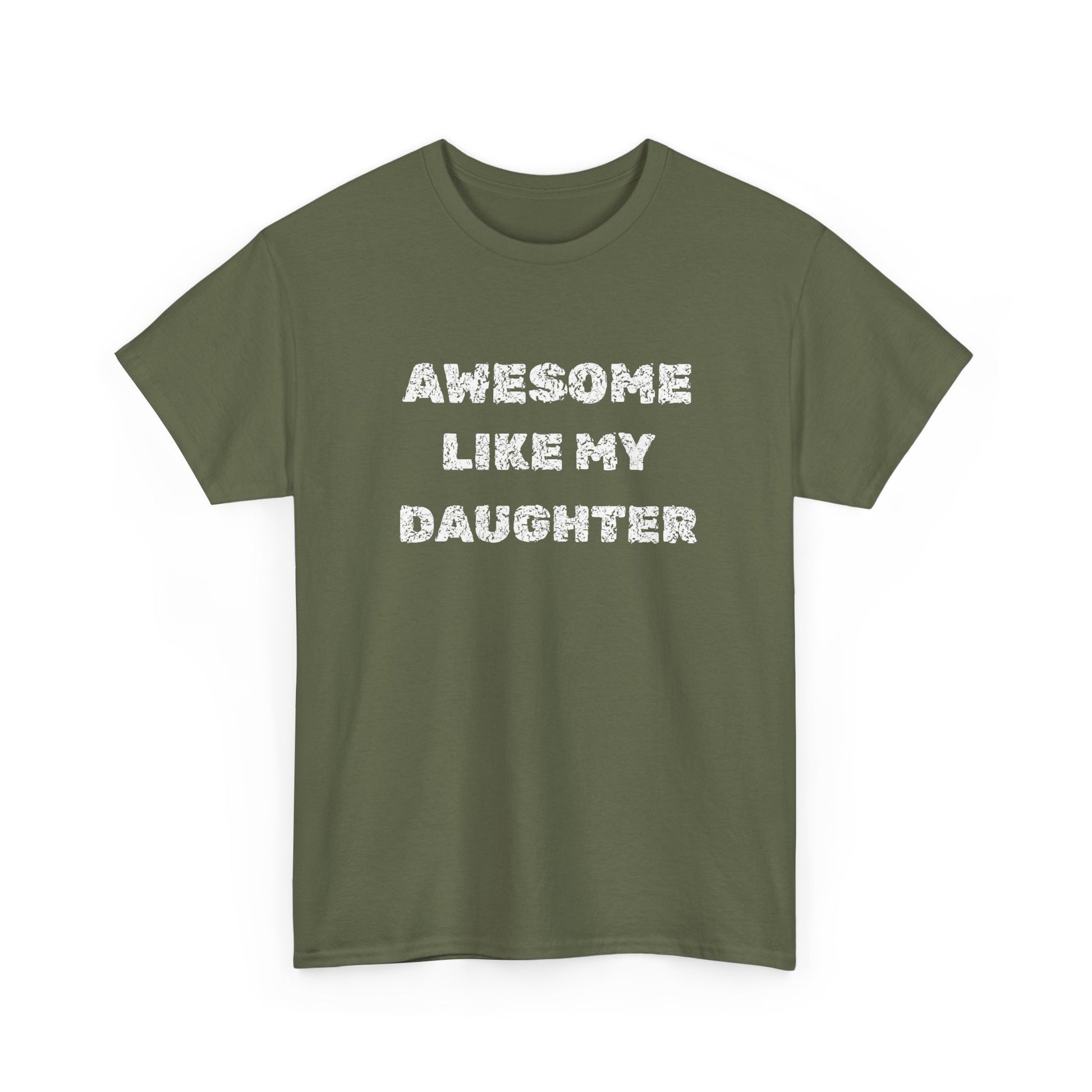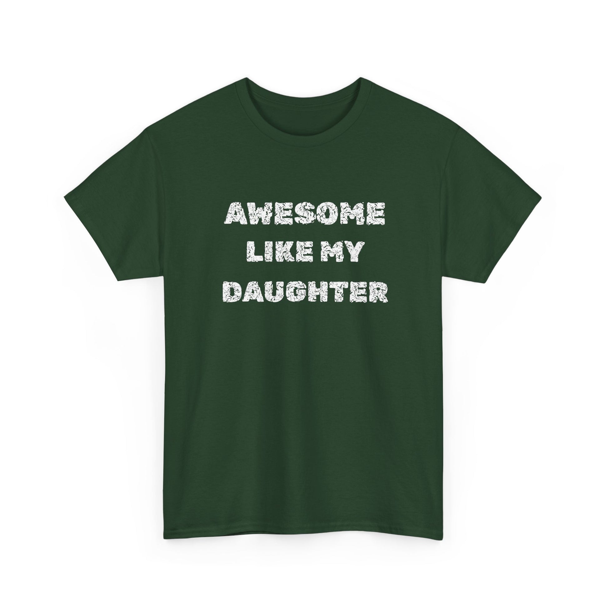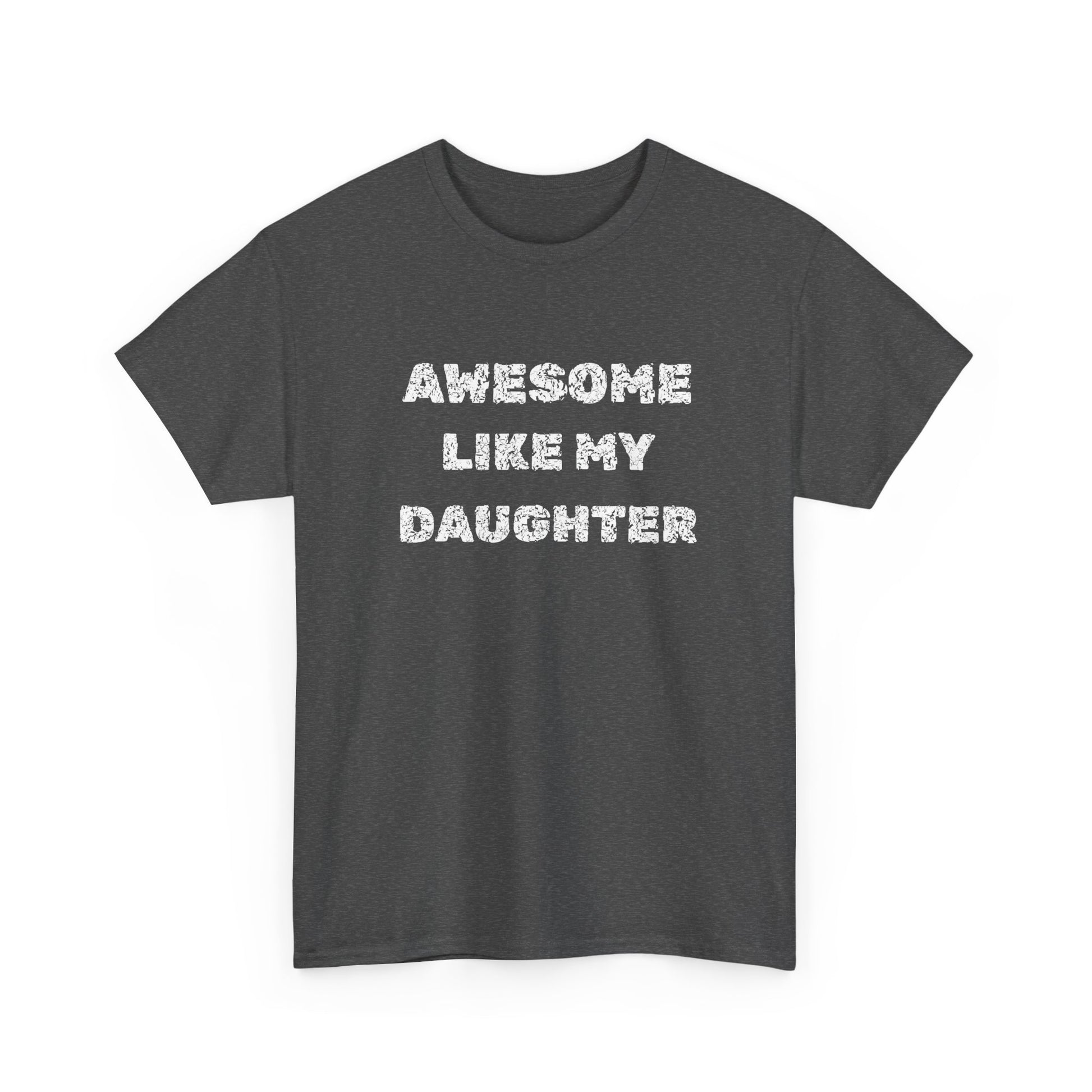 This tee carries a proud, playful message — ‘Awesome Like My Daughter’ — meant for the parent who beams every time their kid takes a bow. Lightweight but sturdy, the shirt settles into everyday life: morning school runs, backyard barbecues, and low-key weekend hangs. It reads like a wink during soccer practice and a quiet boast at family gatherings. The relaxed crew neck and classic fit let the wearer move freely while the soft, smooth fabric keeps the print crisp and visible wash after wash. It’s made to be worn often, to spark smiles, and to anchor small moments of parental pride without shouting. The design sits cleanly on the chest, pairing well with jeans, sweatshorts, or a flannel tied around the waist for an easy, familiar look.