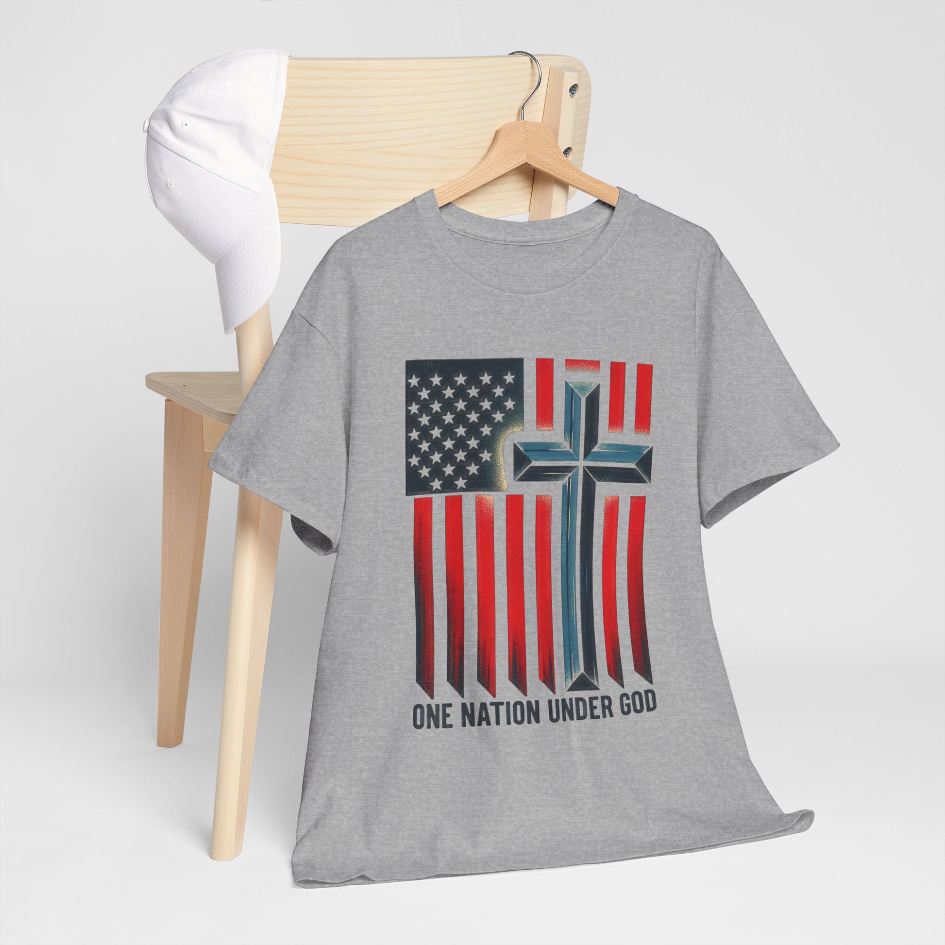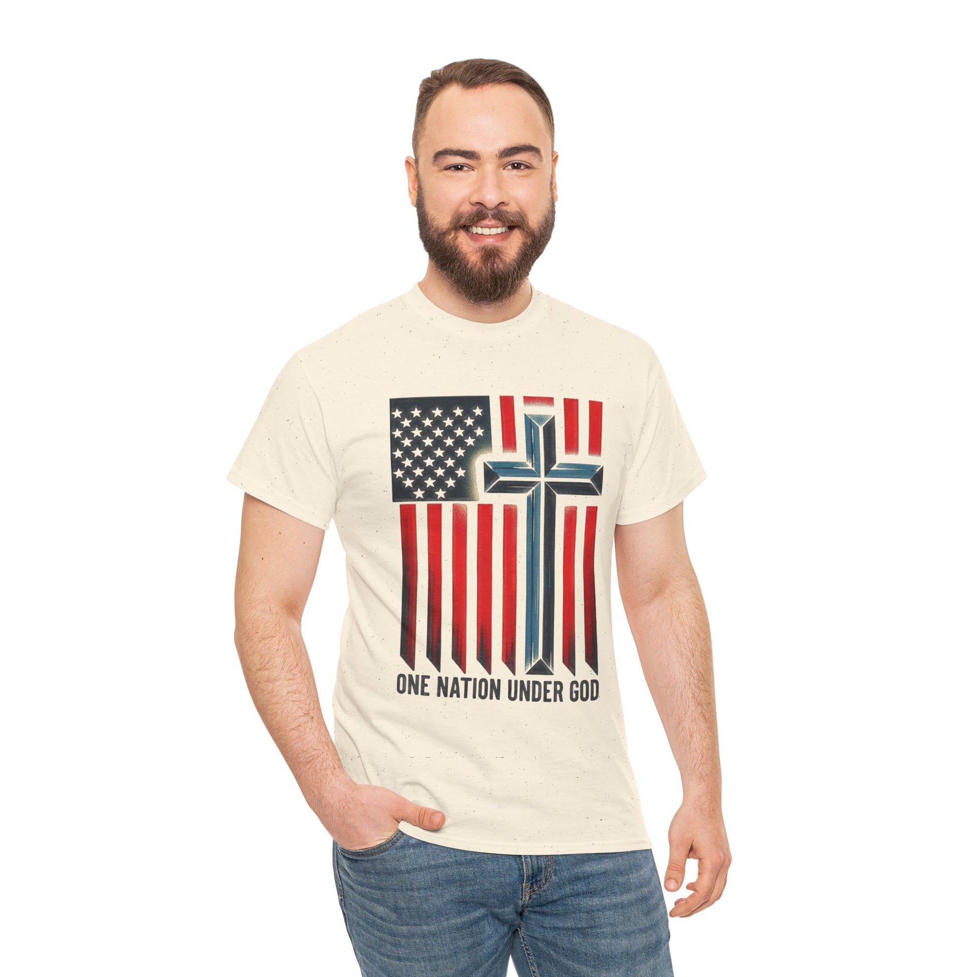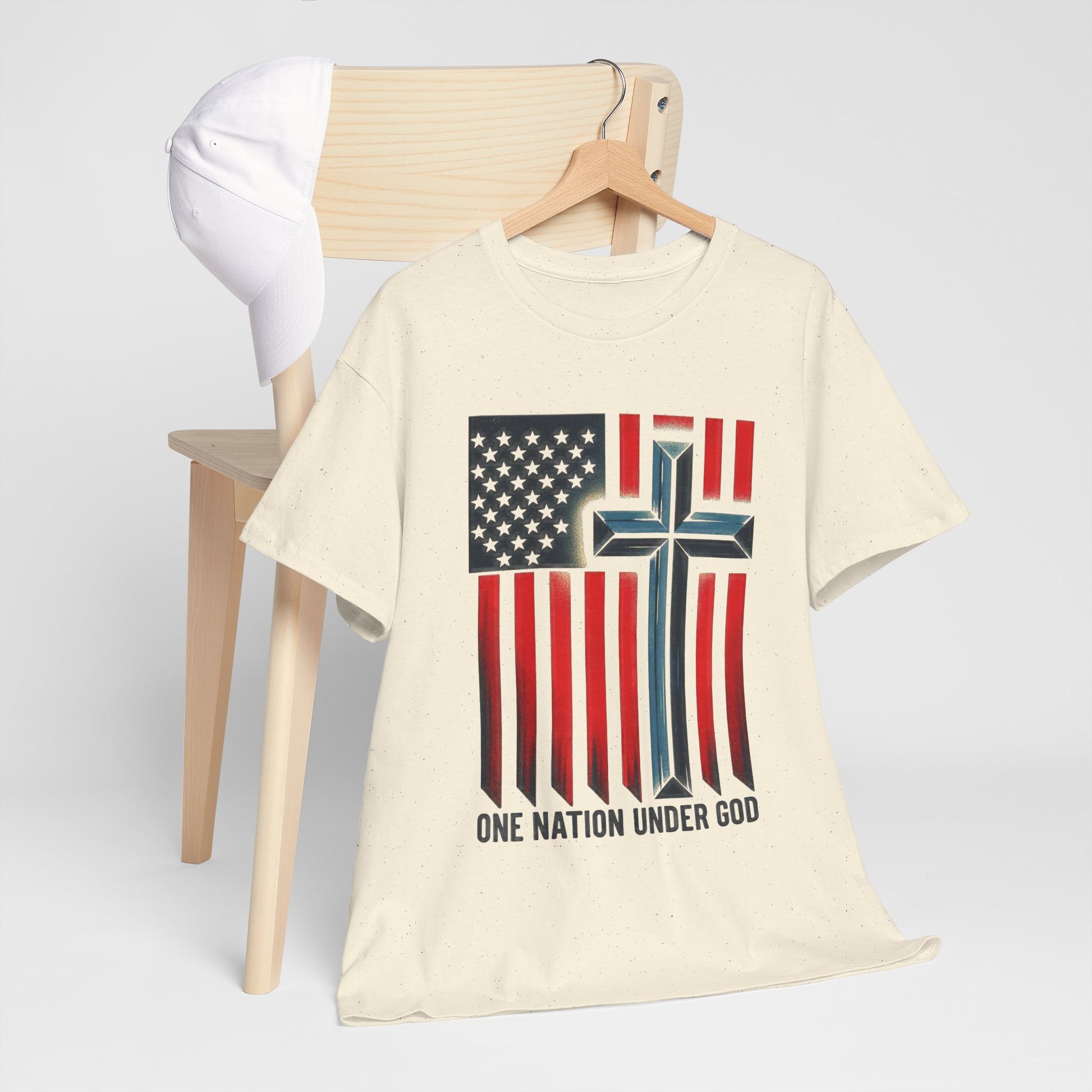 Soft, worn-in comfort meets quiet conviction. This classic crew tee lays a faded American flag across the chest, its stripes falling into a subtle cross and the words “ONE NATION UNDER GOD” grounded beneath. The natural cotton tone and vintage-style print give it a lived-in, every-day look that reads like a quiet statement — faith and country stitched into the fabric of ordinary life. Wear it to church gatherings, small-town parades, community service days, or as a steady layer for weekend routines. It settles easily into a loyal wardrobe: pair with denim, layer under a jacket, or roll the sleeves for a more casual feel. The result is a shirt that feels familiar from the first wear and keeps its shape through repeat wears and washes.