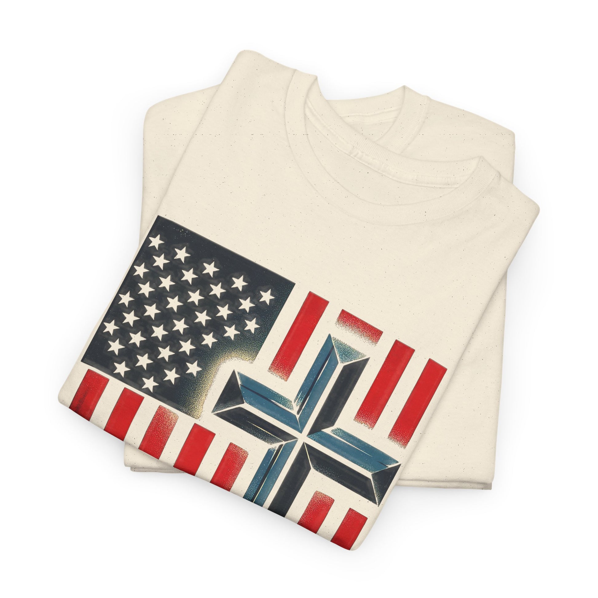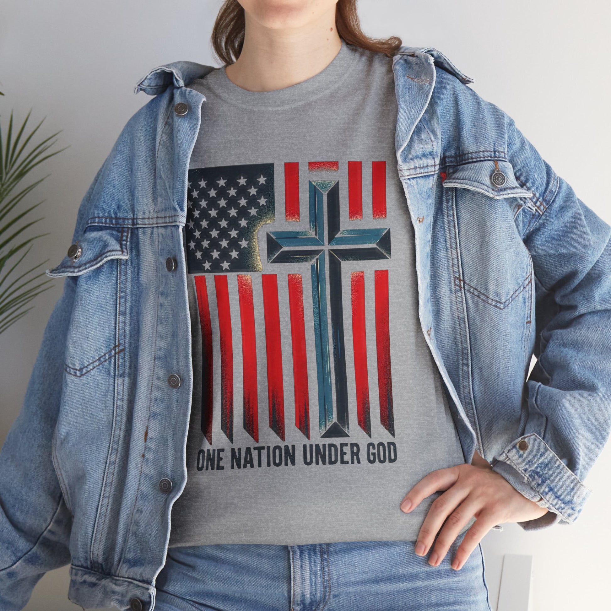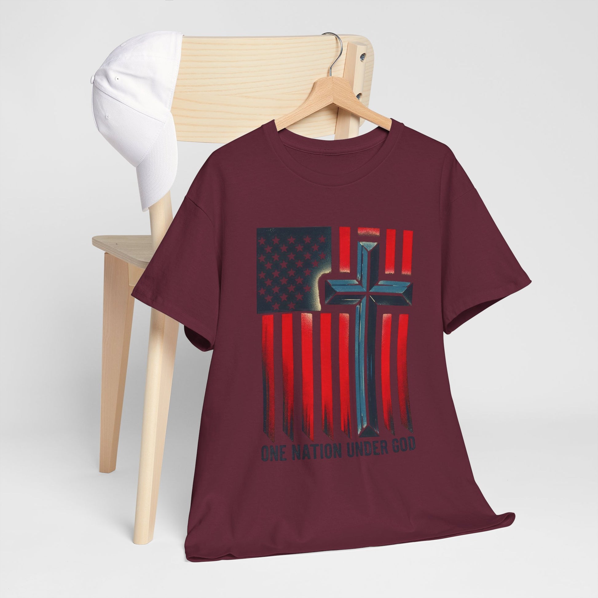 Soft, worn-in comfort meets quiet conviction. This classic crew tee lays a faded American flag across the chest, its stripes falling into a subtle cross and the words “ONE NATION UNDER GOD” grounded beneath. The natural cotton tone and vintage-style print give it a lived-in, every-day look that reads like a quiet statement — faith and country stitched into the fabric of ordinary life. Wear it to church gatherings, small-town parades, community service days, or as a steady layer for weekend routines. It settles easily into a loyal wardrobe: pair with denim, layer under a jacket, or roll the sleeves for a more casual feel. The result is a shirt that feels familiar from the first wear and keeps its shape through repeat wears and washes.