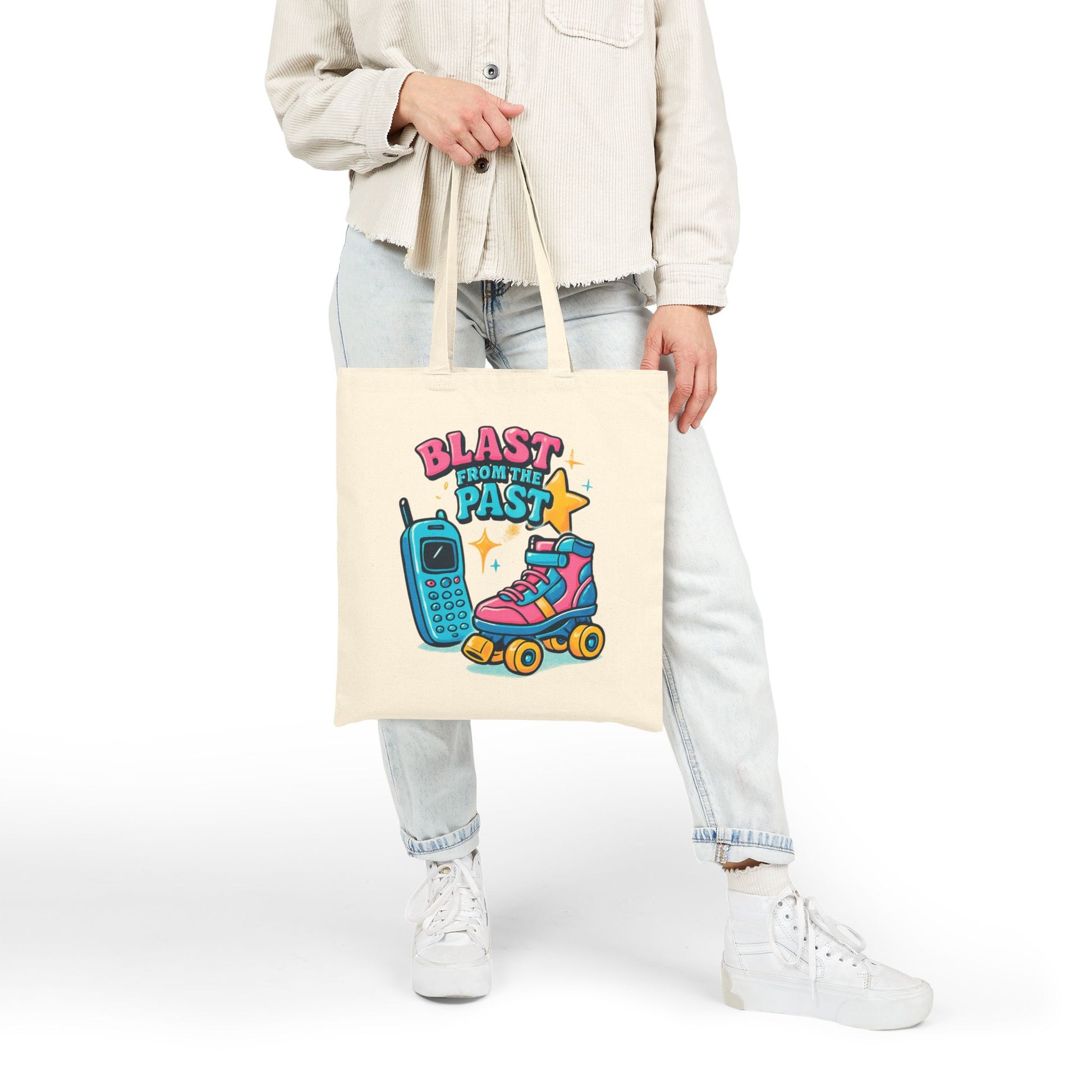 This retro-inspired Tote Bag features a design of roller skates and a cordless phone, giving off a fun and nostalgic vibe. Perfect for those who love vintage items and enjoy a touch of the past in their daily lives. Ideal for carrying groceries, books, or everyday essentials. Great for retro enthusiasts, 80s lovers, and anyone who appreciates a unique and quirky accessory. Perfect for gifting on birthdays, Christmas, or any occasion.